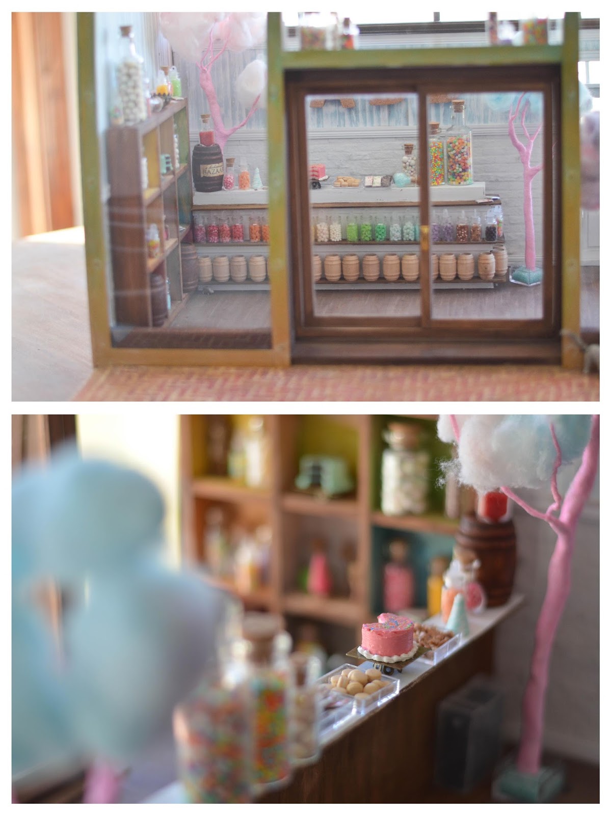 The interior features many handmade candies, as well as a scratch-built candy counter. For fun, I made some cotton candy trees! The ceiling is removable, along with the back wall. The back wall has two separate parts- the window and the lower wall. This makes is much easier to photograph all the mini details!
